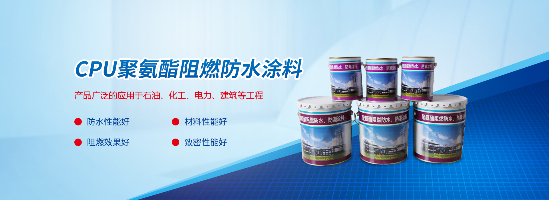 CPU聚氨酯阻燃防水涂料,是以帶有異氰酸基(一NCO)的化合物作為主劑(A組分) 和以軟化劑、防老劑、阻燃劑、填充劑等經特殊加工的硫化劑為固化劑(B組分),構成雙組份的高分子涂膜材料。